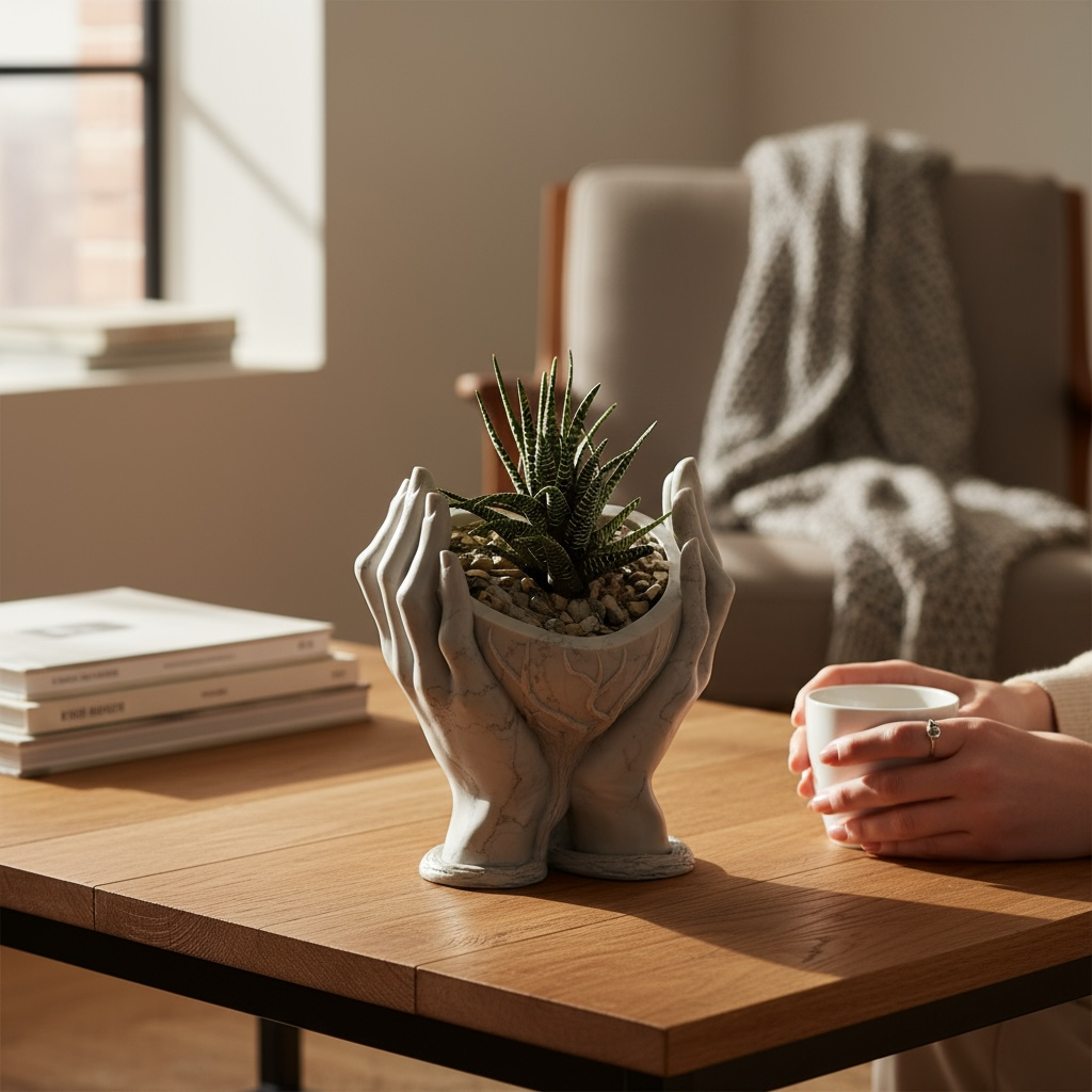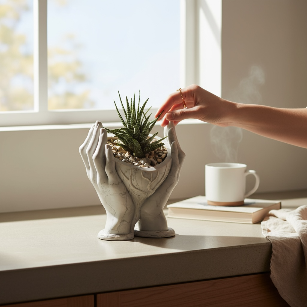Artistic Detail: The textured finish adds a sophisticated, sculptural quality, highlighting the delicate contours of the hands and the intertwined roots on its base.